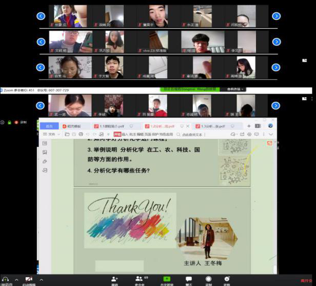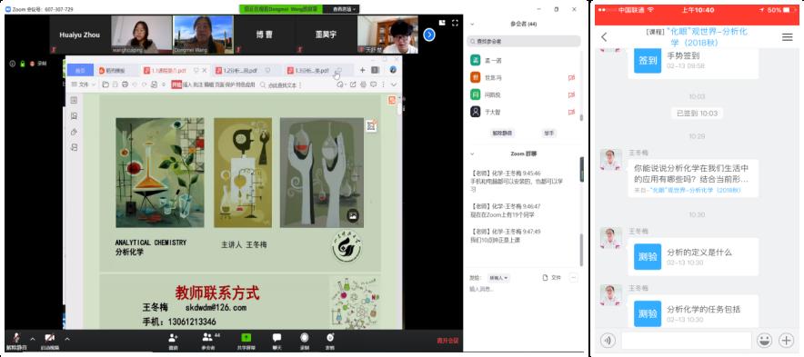 这组照片是山科大化工学院王冬梅老师新学期《分析化学》直播课堂的场景。虽然是在线课堂,王老师也实现了接近面授课的效果:老师同学视频在线、屏幕共享、板书推导、随机测验、解答提问,课堂氛围十分活跃。教师线上点名,并实时监控同学的上课状态。课后,助教和学生们说,特殊时期开学的第一课竟然有与老师面对面上课的真实感和紧迫感,为直播课的形式点赞!