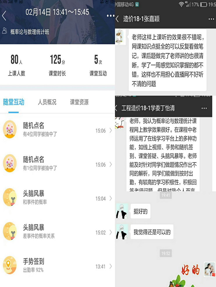 安全工程18-1班冷茹雪同学说:“概率论与数理统计课上我充分感受到了老师的热情,老师在讲授中多次设置问题、邀请同学们积极打开语音回答互动,课前课后老师都会梳理本节课的知识框架,让我的课堂笔记更加有逻辑性,在课下总结的时候可以一目了然。课堂的效果远远超出我的预想。在这里我也想给老师们点一个大大的赞!”