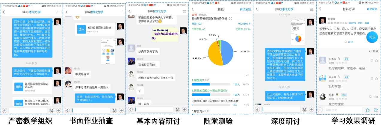 疫情就是命令,作为教师,在特殊时期最大的责任要做好教学设计,保证教学进程顺利进行,更要保障教学质量。材料力学在线课程于2018年在学银在线上线运行,至今已运行至第5期,已建设完成包括全程教学视频、习题讲解视频、讨论问题库、趣味问题库、资料库、试题库建设等在内的各类教学资源,逐步形成了“4+2”混合式教学模式。但此次不同,没有了最重要的实体课堂教学环节,如何实现两者转接?我们经过不断尝试,反复思考,重点解决了两个问题:一是解决如何将远程状态不可控的“松散个体”组建成有凝聚力的“空中班级”,让学生有团体感和课堂感;二是如何借助在线平台资源重塑原实体教学的教学流程,并将其移植至空中课堂。