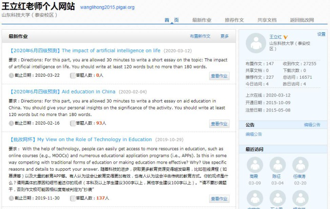 批改网是英语教研室四年前引进、熟练使用的英语作文及翻译网络自主批改平台。泰安校区共23位老师和6478名学生注册使用批改网,学生共修改作文273731次。经过四年多的教学实践,其优越性和易操控性为师生所接受,辅助教学效果显著。我们认为,在疫情期间更应发挥批改网的优势和作用,助力英语教学。所以,我们坚持使用批改网,坚持每周为学生布置作文和翻译作业,为学生的四、六级英语考试做好前期准备。