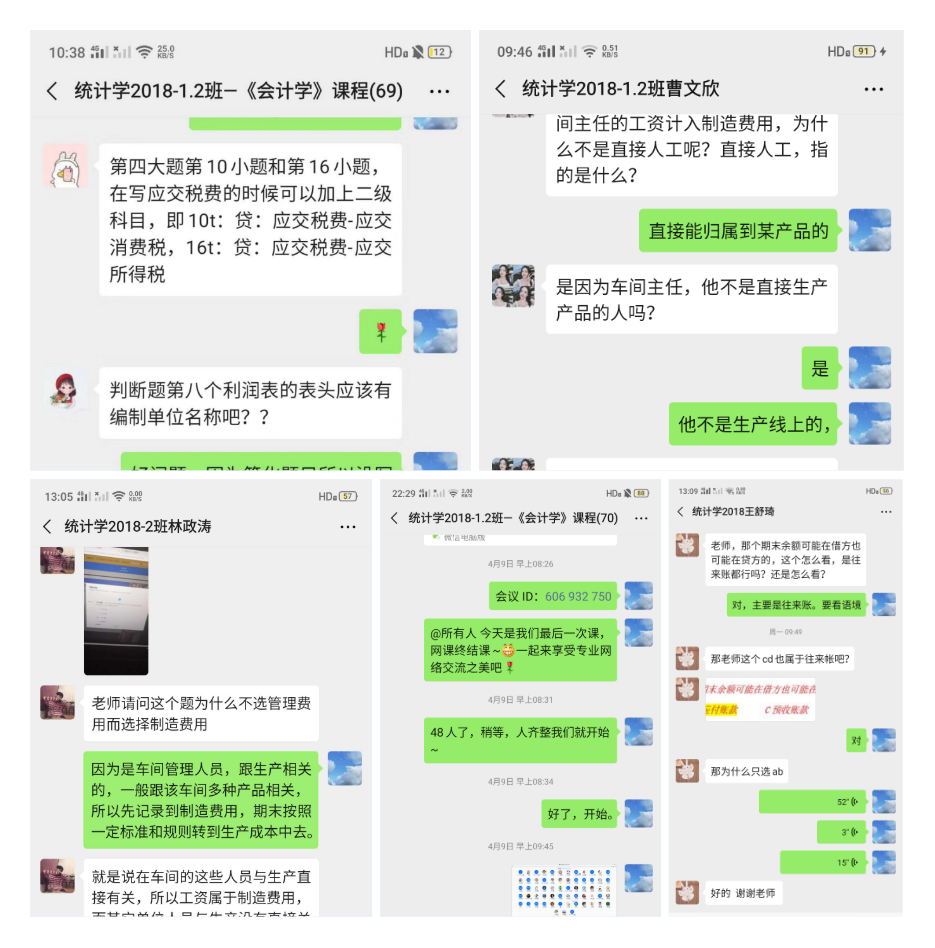 2月10日起,统计学2018-1.2班《会计学(B)》按照课表时间开启线上教学。对于统计学专业的同学来说,会计学课程是一门会计学专业入门课,又是唯一一门接触到的对未来专业工作和深造学习有补益的会计学课程。这门课程的入门难,比较公认;同时,其对数据分析的内涵补充以及含义识别,意义深远。因此,明确这点后,师生都有了比较充分的认识和积极的投入,这也是师生能够努力克服网课各种困难与弊端,发挥其优势,达到教学目标的动力源泉。