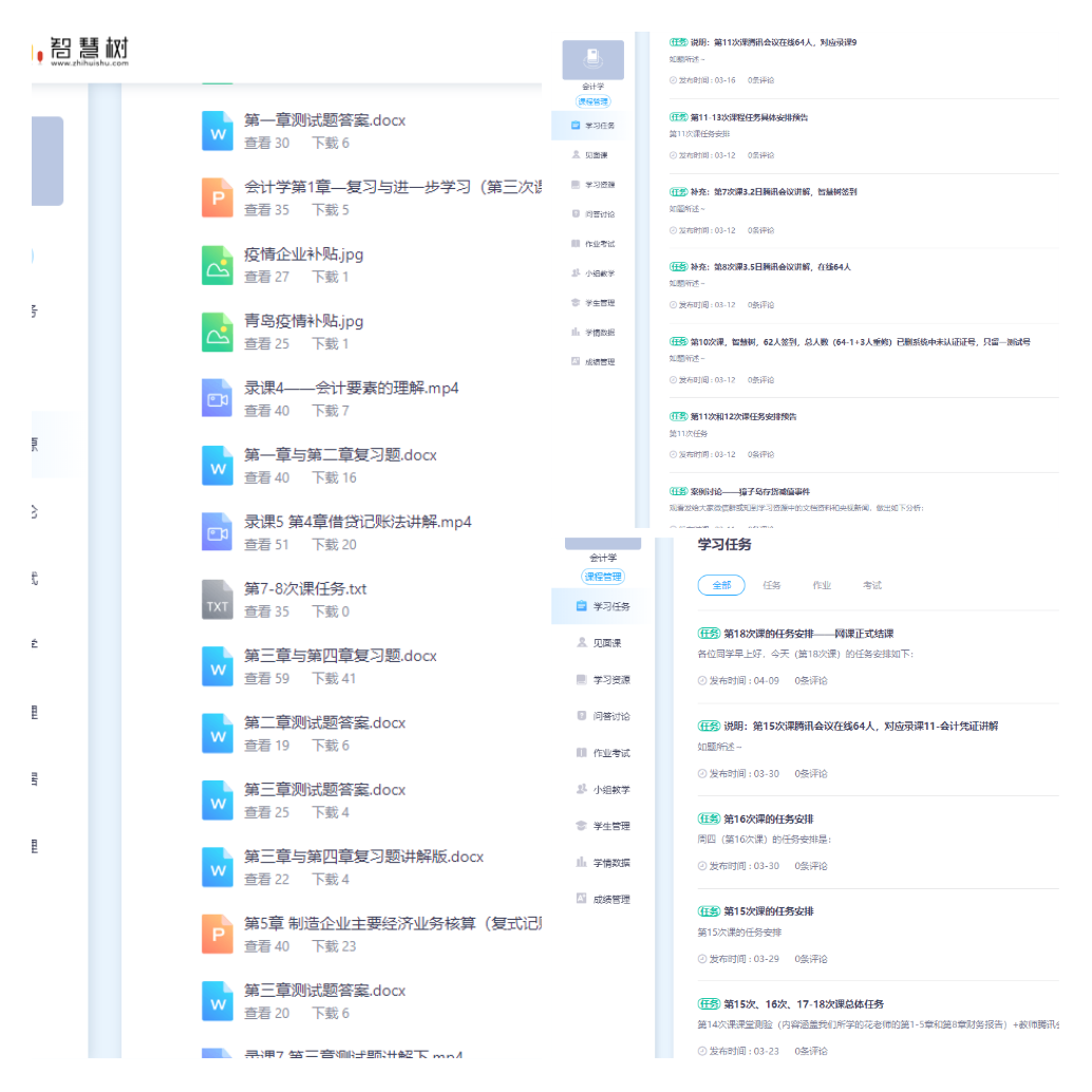 智慧树(知到)共享课采用李芳老师主持的会计学课程视频,每次课布置一部分视频的学习,视频较短,且与统计学班课程内容不是完全匹配,因此用了大部分但不是全部章节。