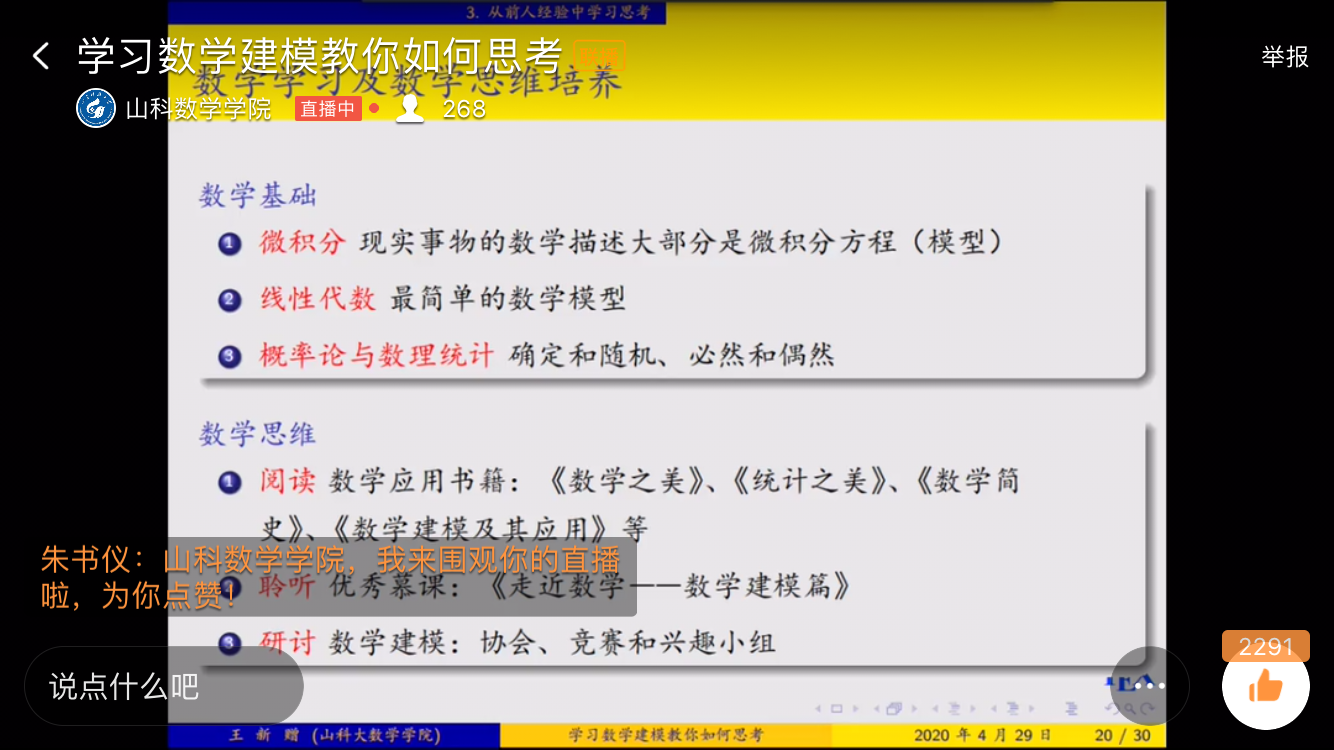 4月29日下午,数学学院王新赠副教授面向全校学生作了题为“学习数学建模教你如何思考“直播讲座。