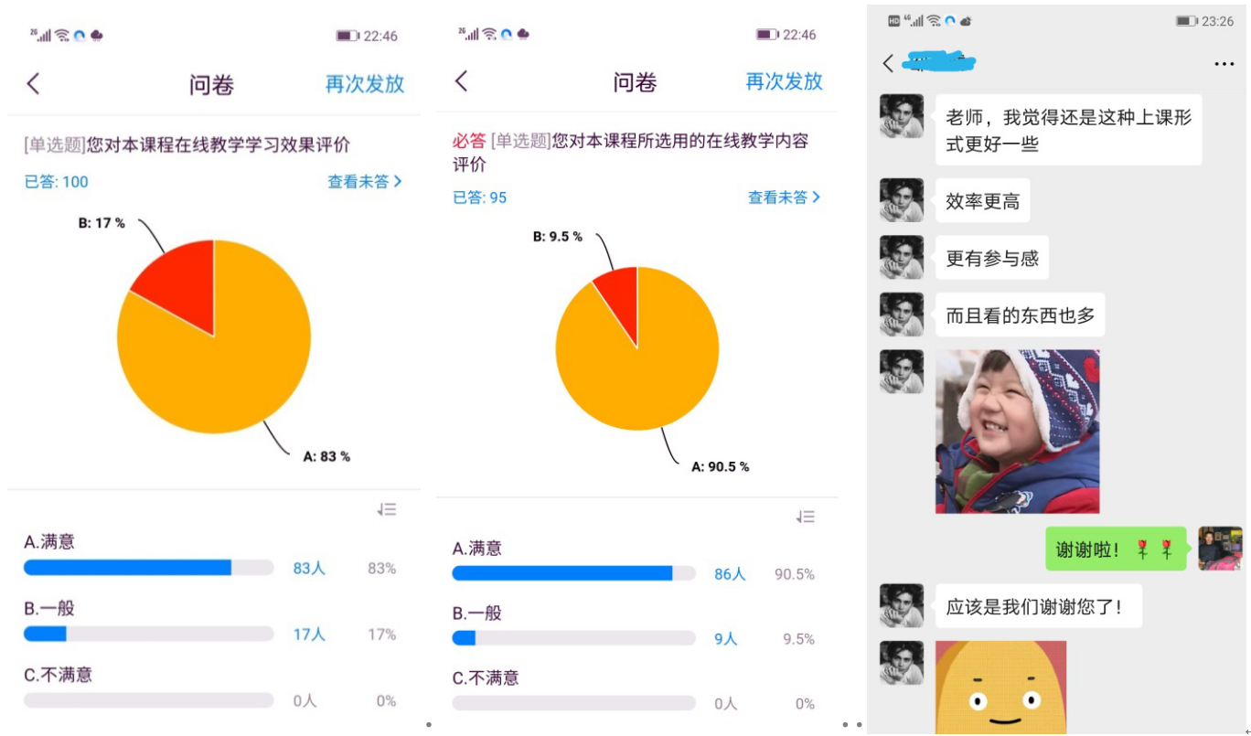 为了更好地提升线上教学效果,教师会通过课程平台开展一些有针对性的线上“问卷调查”及“课程教学反馈”,及时了解学生需求。通过“问卷调查”,学生对线上教学在线教学内容、教学效果、教学方式等方面给予充分肯定。
