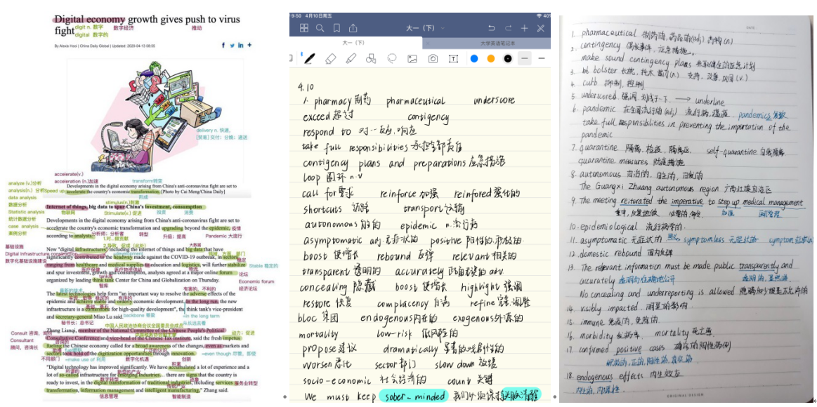 教学内容制定:以英语阅读教学为主,内容聚焦疫情相关报道,文章主要来自“中国日报英文网”(http://www.chinadaily.com.cn/)及“中国政府英文网”(http://english.www.gov.cn/)。其报道权威,代表中国声音。其内容涉及国内外疫情相关专题报道、中国在抗击疫情中表现出来的众志成城抗“疫”精神、中国对全球遭受疫情国家的援助和大国担当、习近平主席在G20峰会上有关全球团结一致抗击疫情的重要讲话、疫情对国内外经济、政治、外交、教育方式的负面影响与相应对策、倡导抗击疫情全球团结协作,反对将病毒政治化、污名化等疫情相关专题报道及社评。所选文章内容新颖、时代感强,英文语言表达地道,英语词汇涉及面广,弥补教材在这方面的不足。
