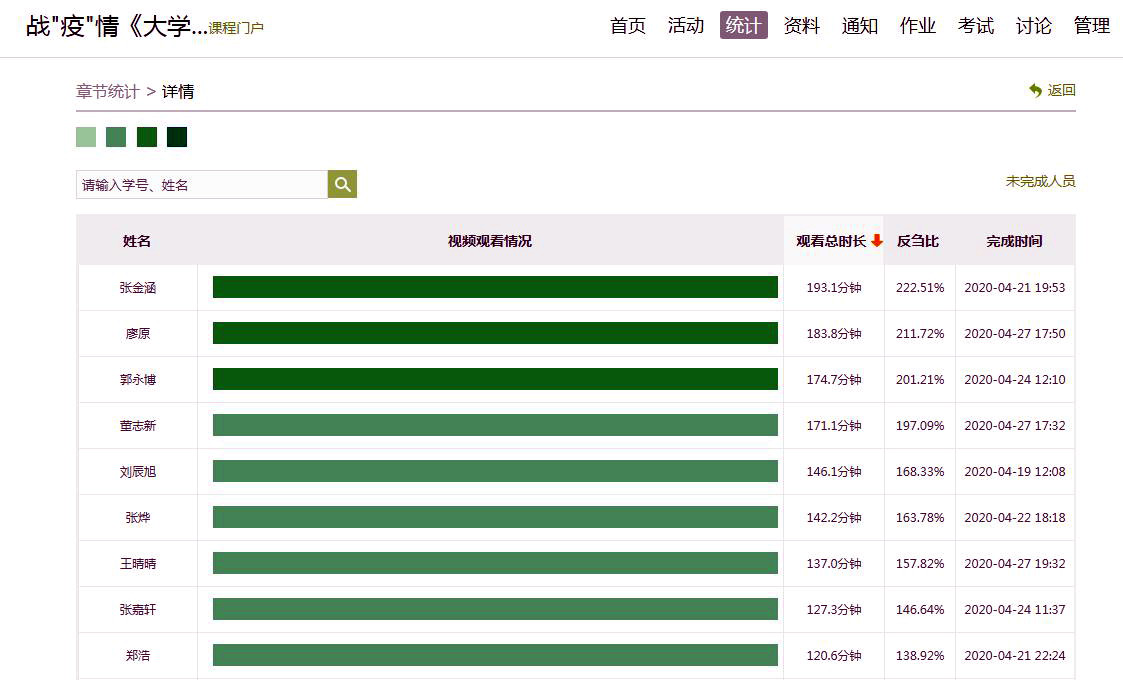 学生自主学习阶段章节任务点完成情况