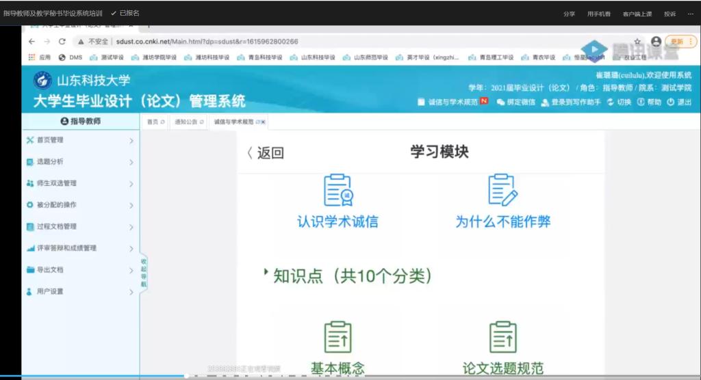 培训会邀请了中国知网技术人员介绍了我校大学生毕业设计(论文)管理系统的功能、操作流程做了整体介绍,并分别从指导教师、教学秘书两个角色演示了毕业设计(论文)系统内选题、任务书、开题、论文评审、答辩、成绩评定等环节的信息化管理操作过程。